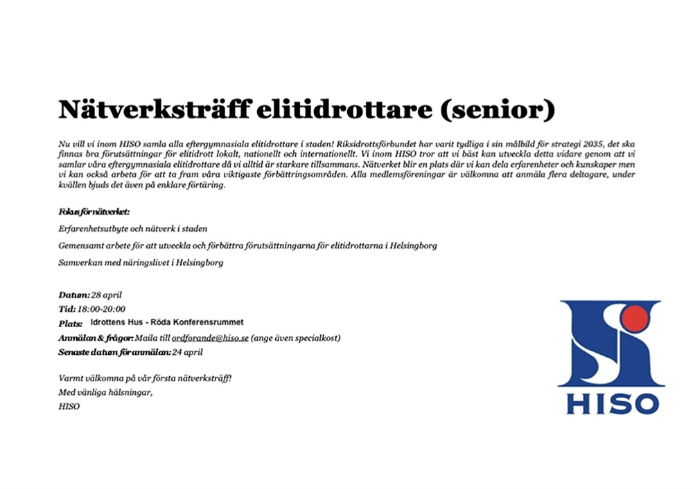 Nu vill vi inom HISO samla alla eftergymnasiala elitidrottare i staden! Riksidrottsförbundet har varit tydliga i sin målbild för strategi 2035,